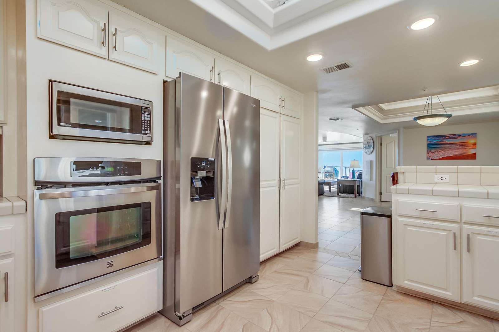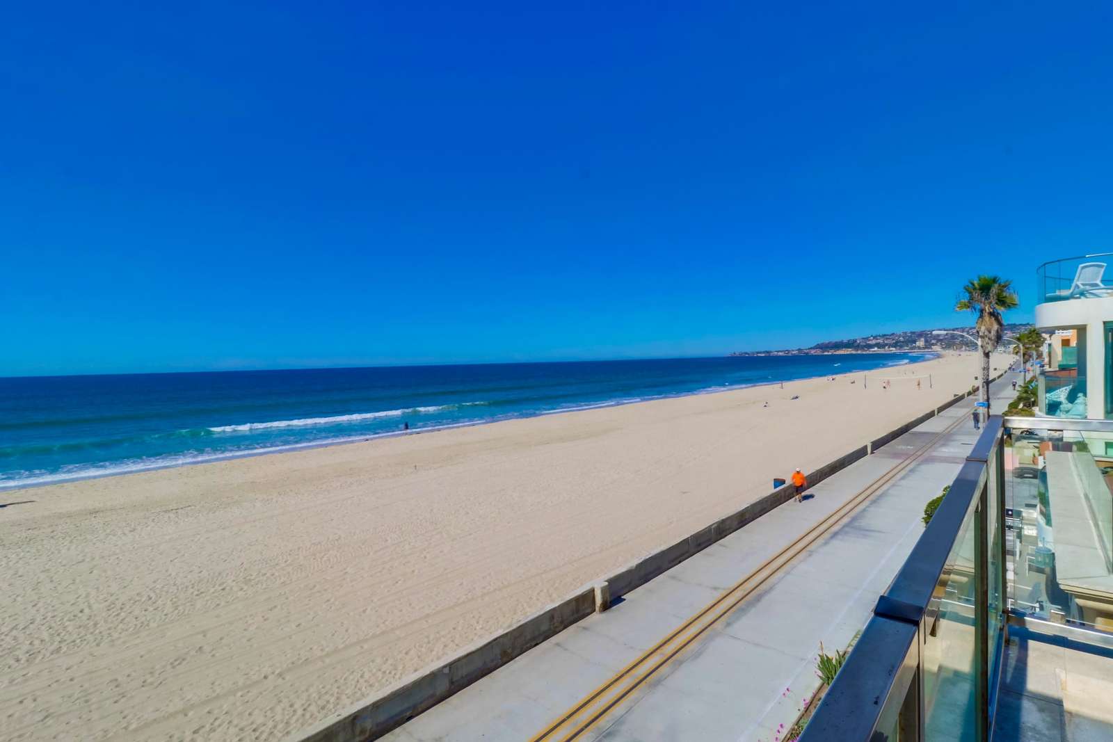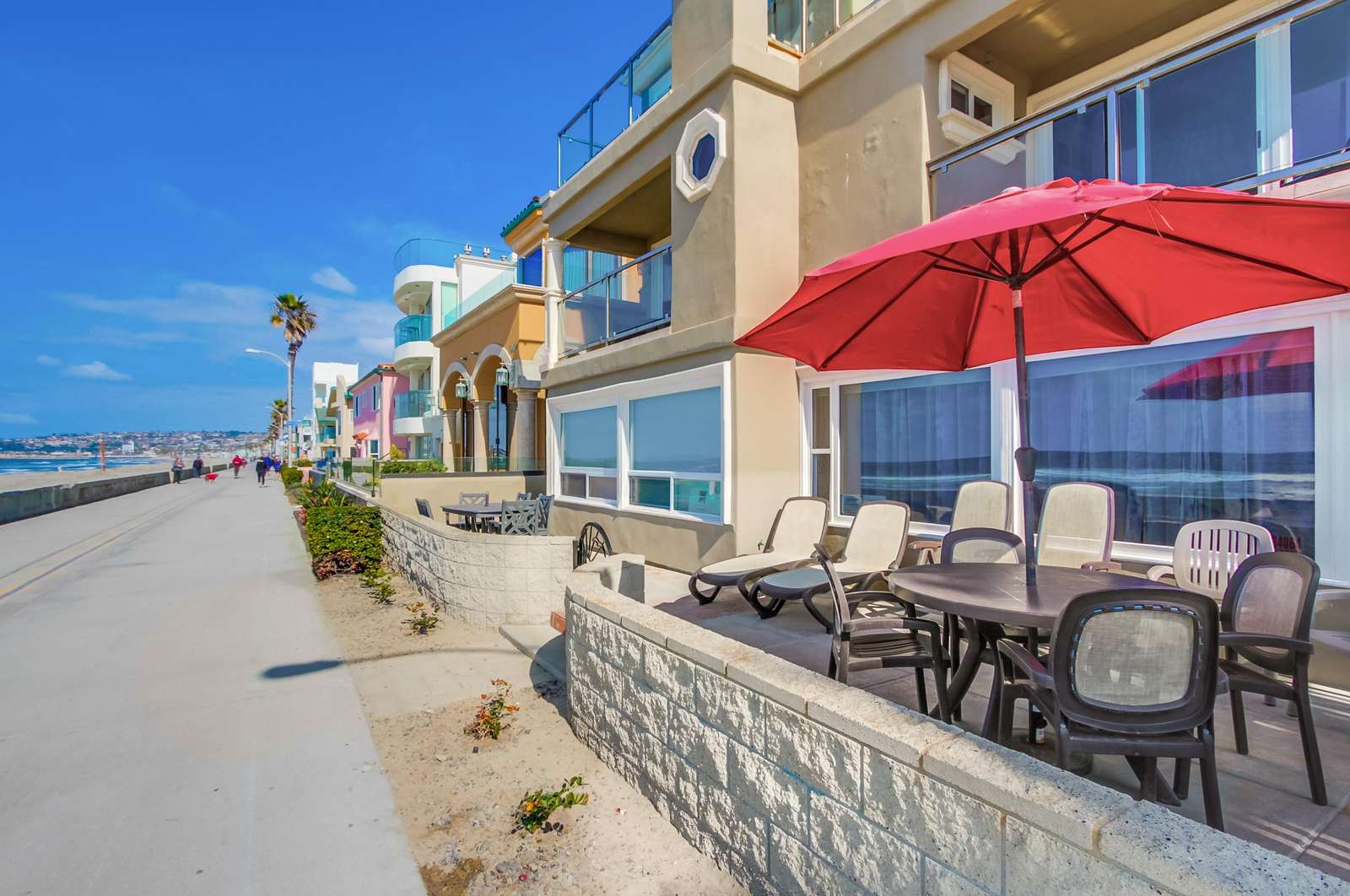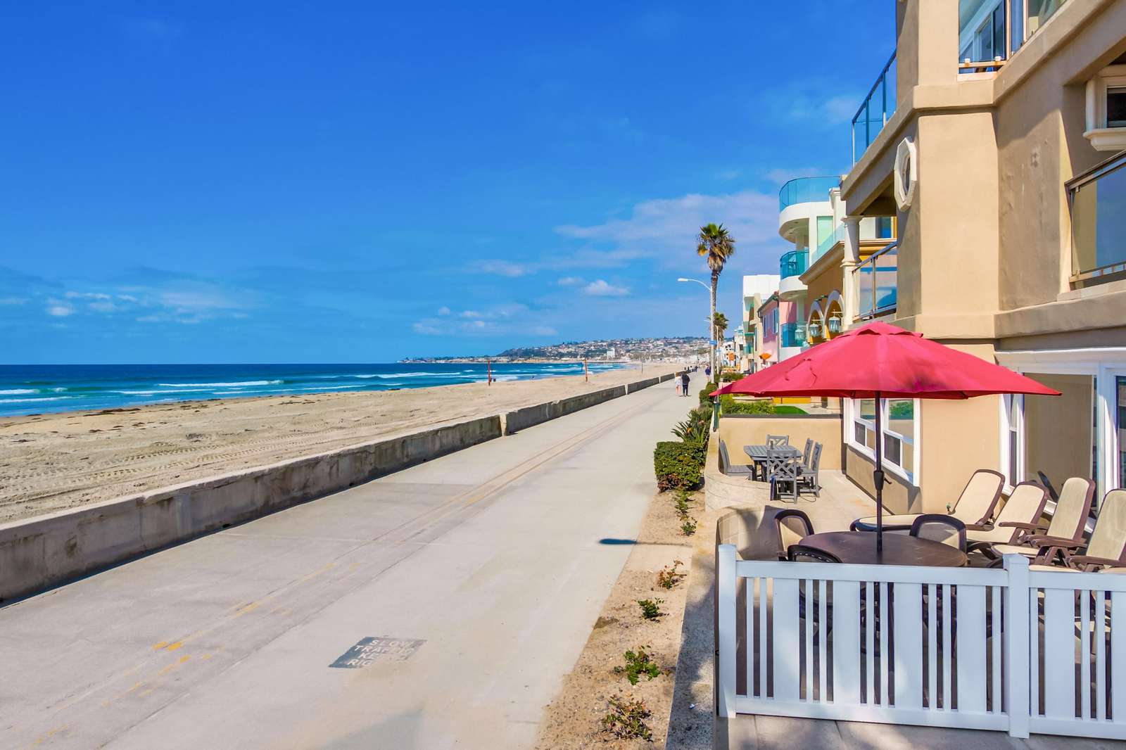 Perfect for entertaining with a large kitchen, dining area, and a large living room complete with flat screen TV. Kitchen is fully stocked with all new stainless steel appliances. The magnificent balcony with a bar and chairs is a fun area to eat, drink, and enjoy the people watching as the sun sets below the Pacific Ocean. Many tourists and locals travel up and down the paved walkway which runs for miles; it is a great spot to walk, jog, roller blade, or bike.